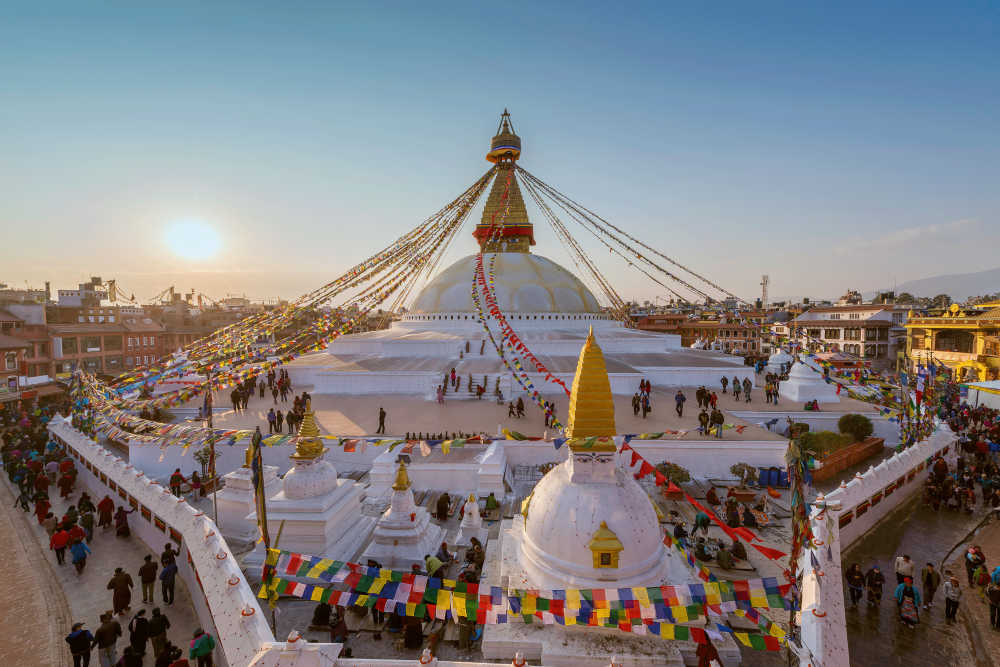 Standing alongside Everest as one of Nepal's most photographed icons, this enormous Buddhist stupa seems familiar even to those who are making their first visit to Kathmandu. Sitting on an octagonal base, with the eyes of the Buddha looking out from all four sides of its central spire and colourful prayer flags radiating out in every direction, the stupa is a mesmerizing sight. Beneath it, pilgrims and maroon-robed monks spin prayer wheels. Anyone wanting to walk around the stupa should accord with custom and do so in a clockwise fashion. For those who want to watch rather than participate, the surrounding rooftop restaurants offer good vantage points to take in the scene.